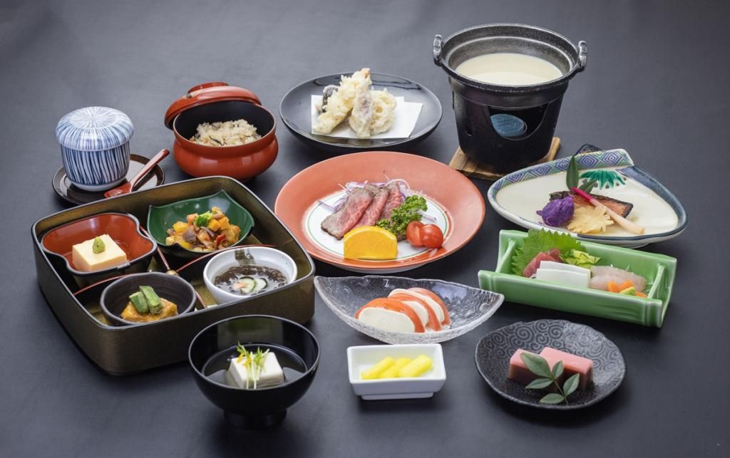 豆腐カプレーゼ・豆腐パンツァレラ・じーまーみ豆腐揚げ出し・玉子豆腐・もずく酢・手作り豆腐・県産金目鯛西京焼き・旬海鮮三種盛り・天麩羅五種盛り・ローストビーフ バルサミコソースを添えて・茶碗蒸し・じゅうしぃ・県産野菜彩り香の物・おぼろ豆腐・県産さつま芋羊羹浮島