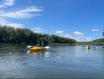 ラフティング・ダッキーが激しいコースを下るのに対して流れの緩やかなところを滑るように進み、のんびり自然を楽しみながら下るのがシットオンファンカヤック!