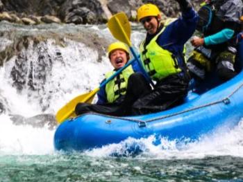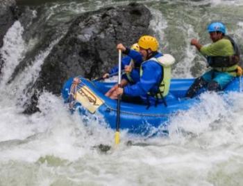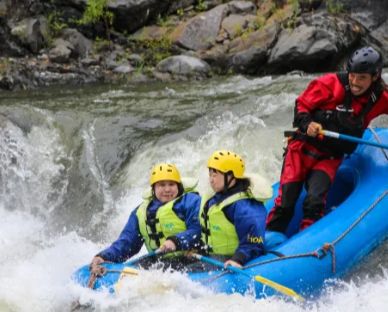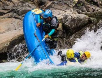 ミニラフティングは、グループでゴムボートに乗り、ガイドの指示に従って、1人1人がパドルを漕いで川を下るアウトドアスポーツです。2-7名のチームが、1人のガイドと一緒にラフティングボートに乗り、ガイドの指示に従って、パドルを漕ぎながら、チームで力を合わせて下っていきます。