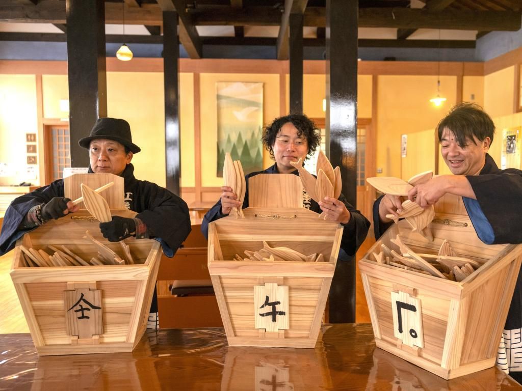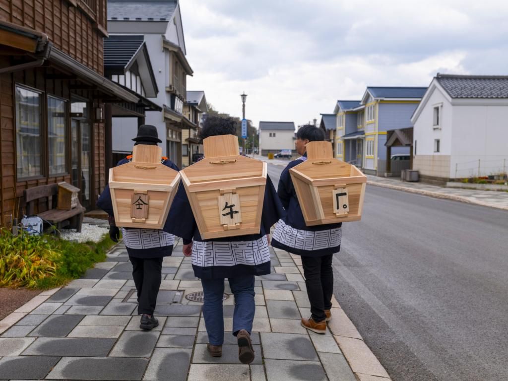 モッコの所有を示す「屋号」を描いたり、かつて北前船交易で繁栄を極めた頃の街並みを再現したストリート〈いにしえ街道〉を「モッコ」を背負って散策!ニシン模型で運搬時の重さも体験!
